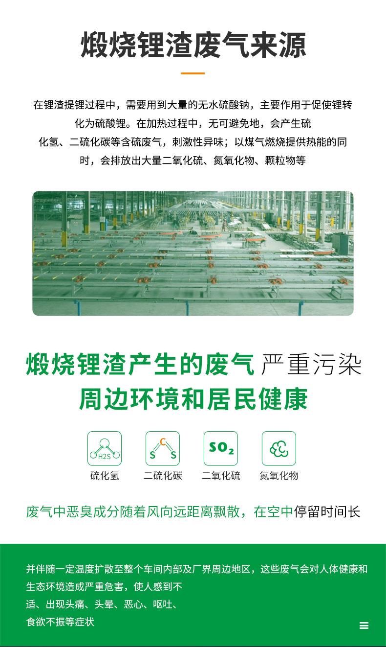 在鋰渣提鋰過程中,需要用到大量的無水硫酸鈉,主要作用于促使鋰轉(zhuǎn)化為硫酸鋰。在加熱過程中,無可避免地,會產(chǎn)生硫化氫、二硫化碳等含硫廢氣,刺激性異味大;